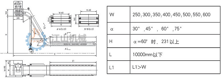 配有机械比较过载保护和电流过载发讯保护装置;各部位的尺寸可根据切屑机械的不同而设计。