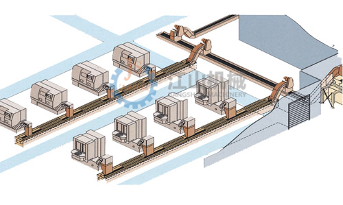 集中输送装置是在一个车间里设置一条主输送装置和若干支线输送装置。机床产生的切屑由支线输送装置输送到主输送装置,再由主输送装置输送到切屑集中处理处。
